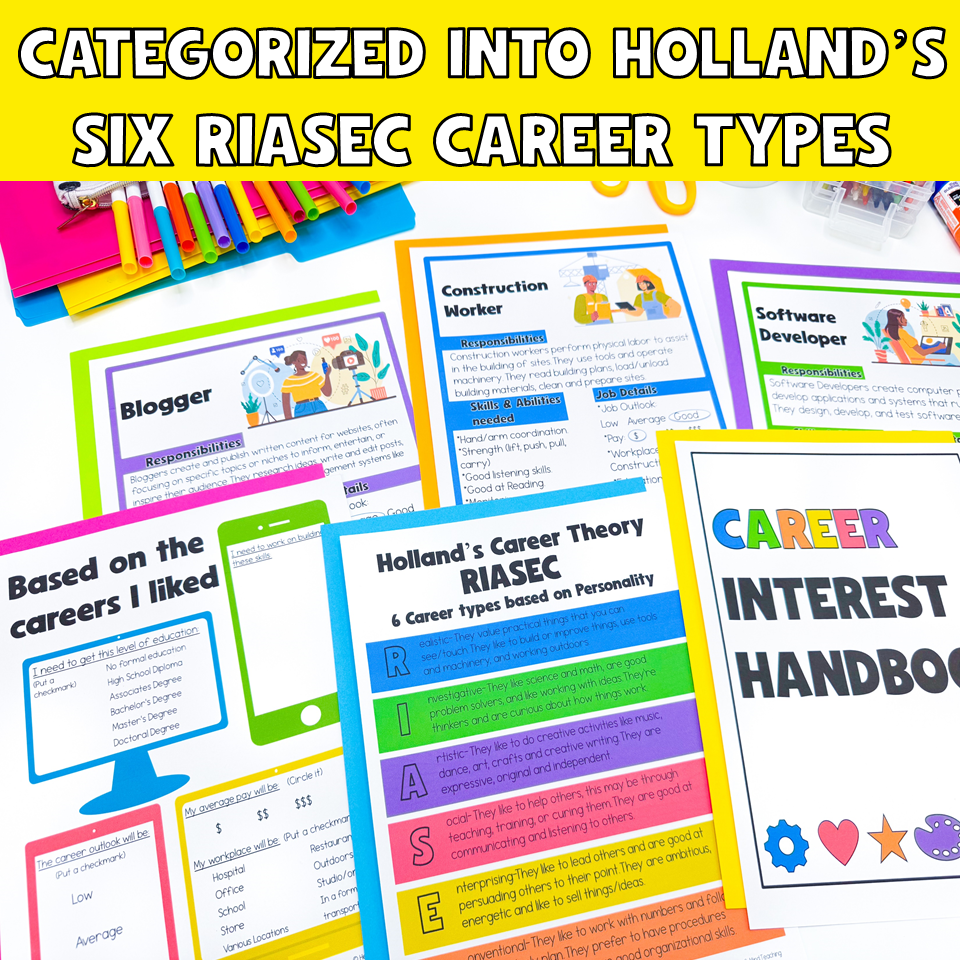 Explore 100 different careers that are categorized into Holland’s Six RIASEC Career Types: Realistic, Investigative, Artistic, Social, Enterprising, Conventional. Perfect for Career Exploration!