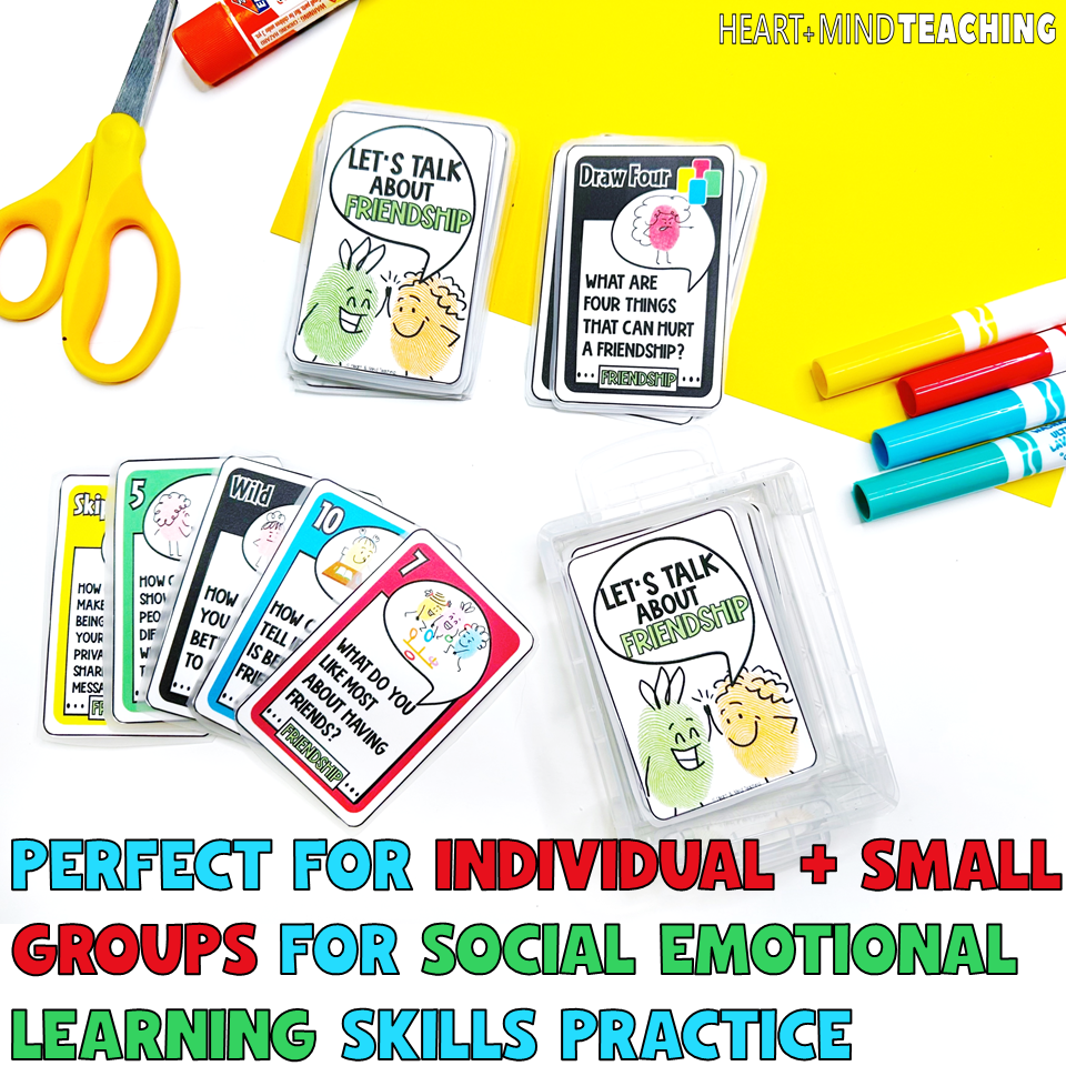 These friendship playing cards are a must-have for individual and small groups for Social Emotional Learning skills practice. Students will answer making and keeping friends discussion questions as they play. This is a perfect centers activity or counseling activity.