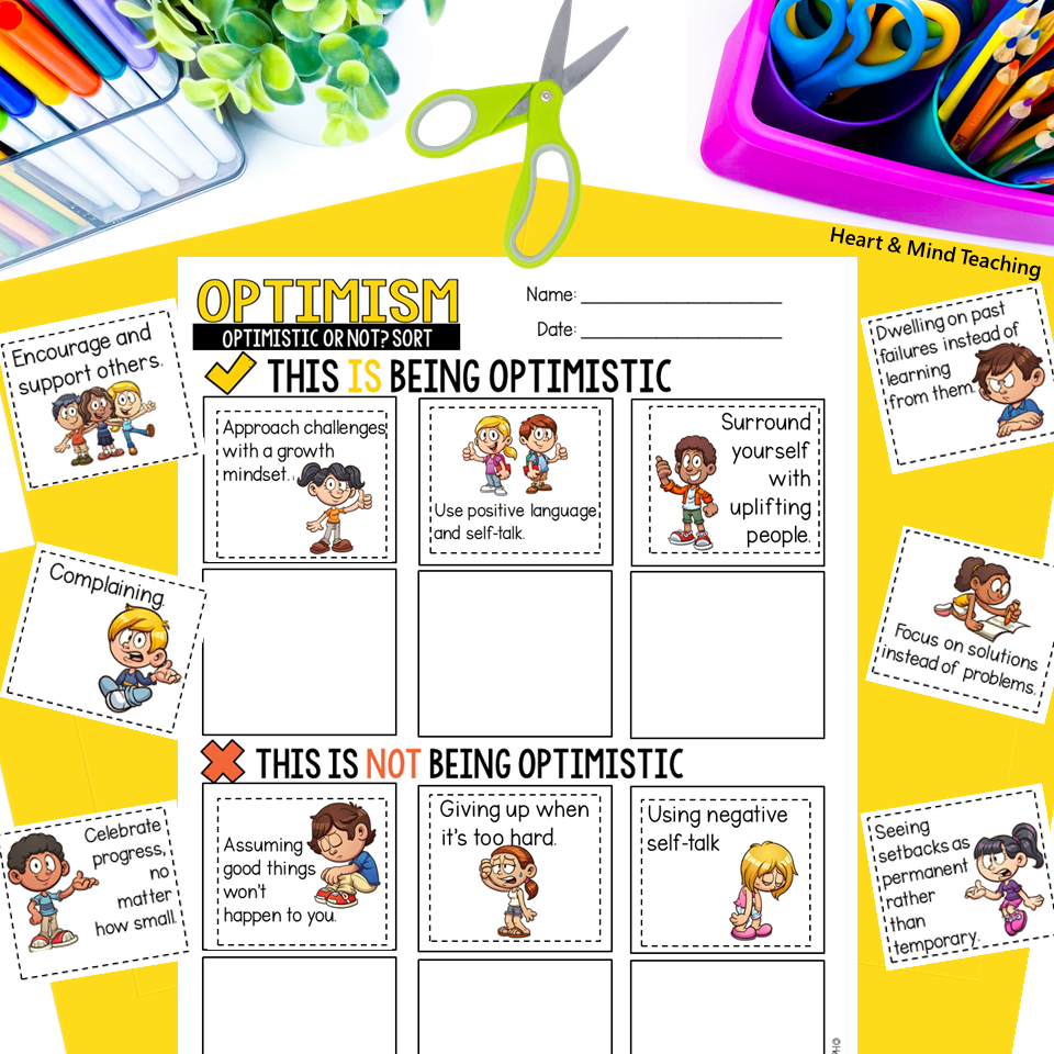 - Ways to show Optimism: Ways to show optimism at school, home, and in your community with a sorting activity (cut and paste)